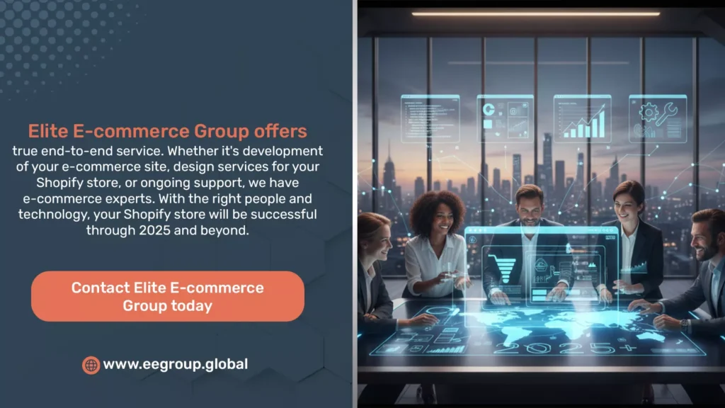 Elite E-commerce Group provides comprehensive, end-to-end services. Whether it’s the development of your e-commerce site, design services for your Shopify store, or ongoing support, we have e-commerce experts to help. With the right people and technology, your Shopify store will be successful through 2025 and beyond.